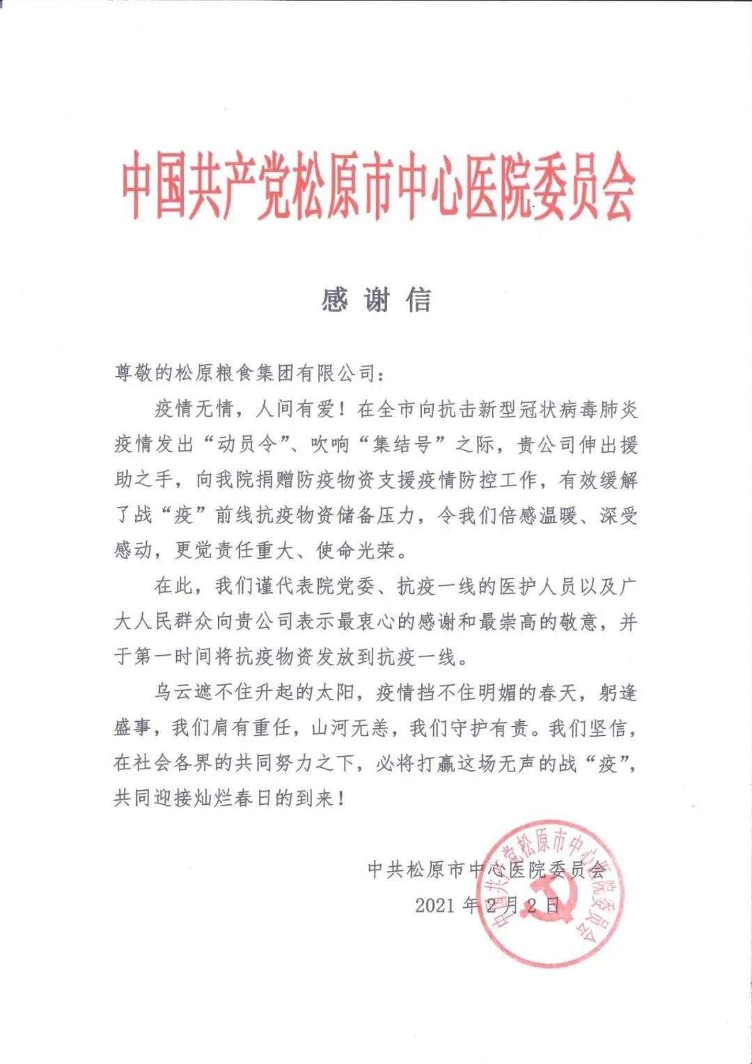 勠力同心,共克时艰。松粮集团在当前疫情防控的关键时期,积极承担社会责任,贡献企业力量,以最短的时间、以最快的速度,统筹安排和部署公司员工积极应对疫情带来的不利影响,在全面做好疫情防控工作的同时,全面保障市场供应。同时,积极开展爱心捐助活动,紧急筹备5000只KN95口罩和30吨大米,捐赠疫情防控一线,以实际行动彰显国企担当。