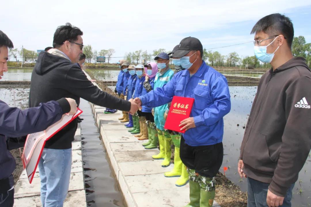 松粮集团宝蒙权董事长为北稻硅谷吉林种业有限公司技术人员和插秧能手颁奖