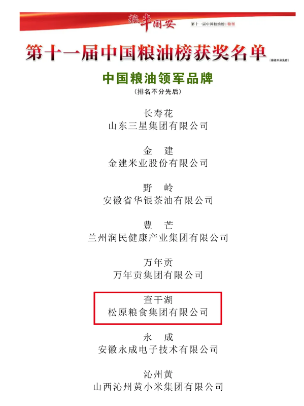这是松粮集团继第五届中国粮油榜荣获“中国百佳粮油企业”和“中国十佳粮油区域领导品牌”大奖后,连续五次荣登中国粮油榜。这些年所获奖项代表着粮油行业和广大消费者对松粮集团多年来以“查干湖”品牌为核心,集中力量,全力打造“查干湖”这张金字招牌的充分认可!