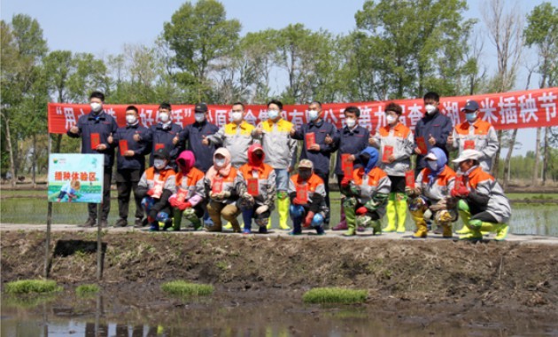 松粮集团宝蒙权书记、马文炳董事长与水稻种植能手们撸起袖子,挽起裤脚,手握稻苗,有序地将一束束秧苗插入稻田之中,描绘了一幅以劳动与智慧相结合的生动画卷。